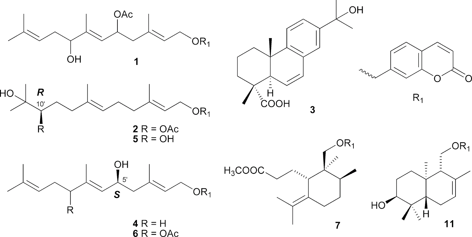 Two new sesquiterpene coumarins, designated 5′-acetoxy-8′-hydroxyumbelliprenin (1) and 10′R-acetoxy-11′-hydroxyumbelliprenin (2), and a new diterpene, 15-hydroxy-6-en-dehydroabietic acid (3), along with 27 known compounds, were isolated from a CHCl3-soluble extract of Ferula assa-foetida through bioassay-guided fractionation. Structures of the new metabolites 13 were identified by spectroscopic data interpretation and by the Mosher ester method. Compounds 4 and 613 showed greater potency against influenza A virus (H1N1) (IC500.26−0.86 μg/mL) than amantadine (IC50 0.92 μg/mL), and 11 exhibited the best potency (IC500.51, 2.6, and 3.4 μg/mL) of these compounds against the HepG2, Hep3B, and MCF-7 cancer cell lines, respectively. Image and text credit. Lee et al 2009. PMID: 19691312
